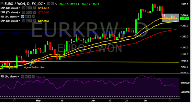 We prefer to take long position in EUR/KRW only above 1,297, stop loss at 1,288 and target of 1,316.