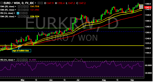 We prefer to take short position on EUR/KRW only below 1,346, stop loss at 1,355 and target of 1,340/1,334.