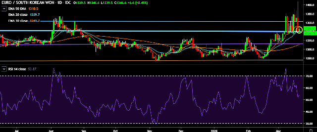 We prefer to take short position on EUR/KRW only below 1,336, stop loss at 1,362 and target of 1,318/1,298.