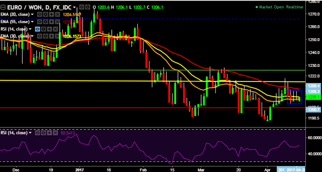 We prefer to take long position in EUR/KRW around 1,204, stop loss at 1,200 and target of 1,211/1,218.