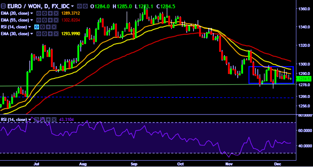 We prefer to take short position on EUR/KRW only below 1,280, stop loss at 1,296 and target of 1,264.