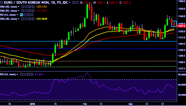 We prefer to take short position on EUR/KRW around 1,330, stop loss at 1,338 and target of 1,315/1,308/1,299.