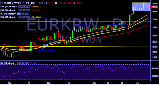 We prefer to take long position on EUR/KRW around 1,310, stop loss at 1,303 and target of 1,338/1,346.