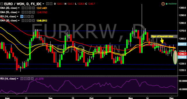 We prefer to go short on EUR/KRW around 1,242, with stop loss at 1,256 and target of 1,237/1,228/1,210.