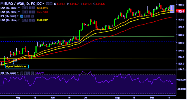 We prefer to take short position on EUR/KRW around 1,345, stop loss at 1,350 and target of 1,334/1,326.