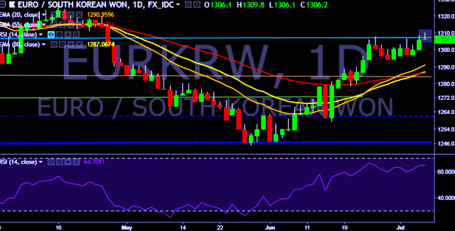 We prefer to take long position on EUR/KRW around 1,305, stop loss at 1,299 and target of 1,315/1,327.