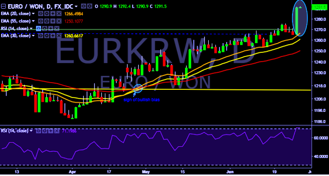 We prefer to take long position in EUR/KRW around 1,288, stop loss at 1,277 and target of 1,304/1,318.