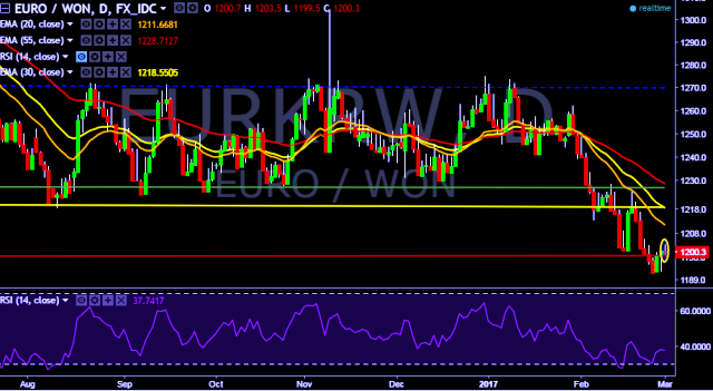 We prefer to take short position in EUR/KRW only below 1,199, stop loss at 1,205 and target of 1,184.