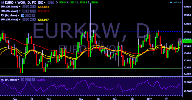 We prefer to take long position in EUR/KRW around 1,260, stop loss at 1,248 and target of 1,272.