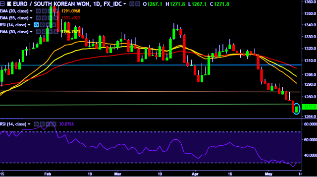 We prefer to take short position on EUR/KRW only below 1,267, stop loss at 1,285 and target of 1,252.