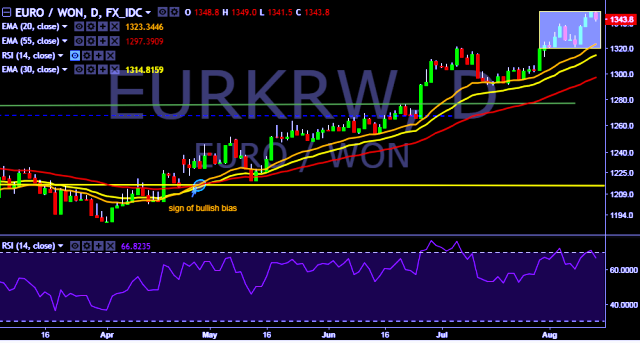 We prefer to take short position on EUR/KRW around 1,345, stop loss at 1,351 and target of 1,337/1,325.
