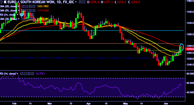 We prefer to take long position on EUR/KRW only above 1,280, stop loss at 1,270 and target of 1,294/1,315.