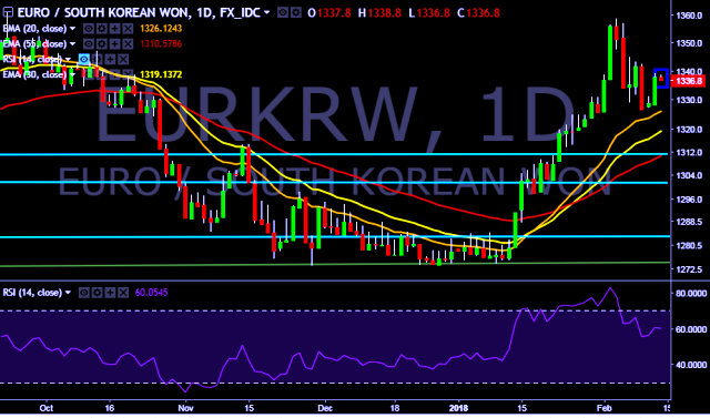 We prefer to take long position on EUR/KRW only above 1,339, stop loss at 1,328 and target of 1,355.