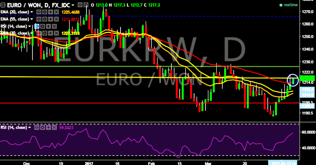 We prefer to take long position in EUR/KRW around 1,215, stop loss at 1,208 and target of 1,228.