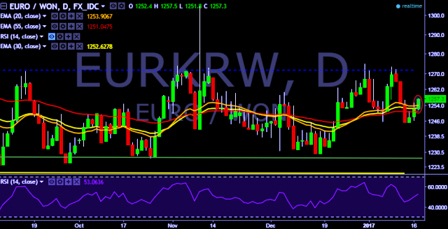 We prefer to take long position on EUR/KRW around 1,255, stop loss at 1,245 and target of 1,268/1,272.