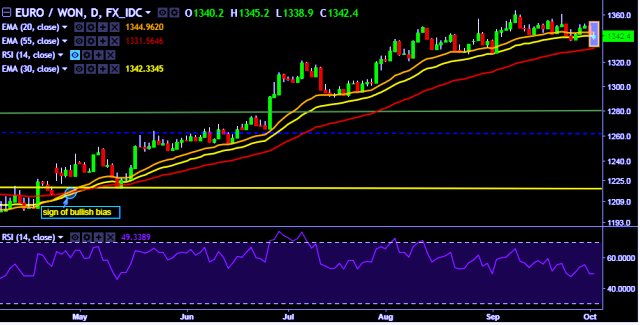 We prefer to take short position on EUR/KRW only below 1,340, stop loss at 1,352 and target of 1,326.