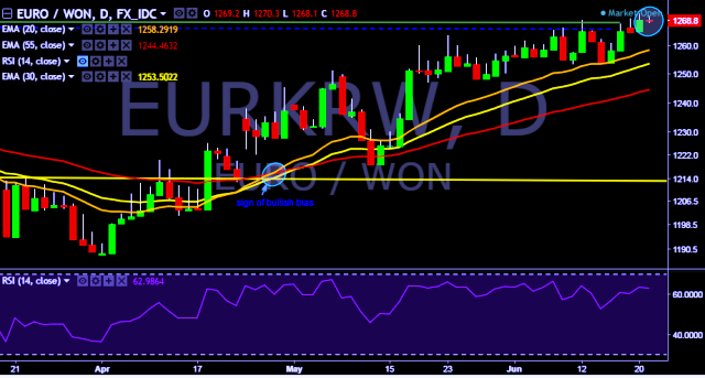 We prefer to take long position in EUR/KRW around 1,268, stop loss 1,260 and target of 1,287/1,304.