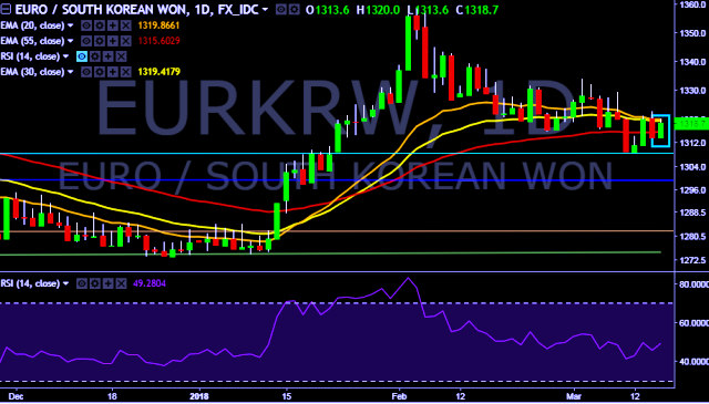 We prefer to take short position on EUR/KRW only below 1,311, stop loss at 1,323 and target of 1,290.