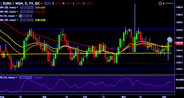 We prefer to go long on EUR/KRW around 1,250, with stop loss at 1,242 and target of 1,260/1,268/1,272.