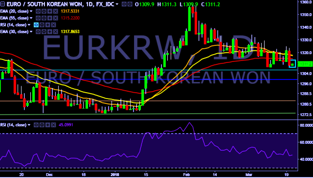 We prefer to take short position on EUR/KRW only below 1,308, stop loss at 1,322 and target of 1,290/1,273.