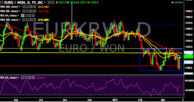 We prefer to take long position in EUR/KRW around 1,212, stop loss at 1,200 and target of 1,219/1,228.