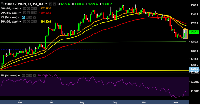 We prefer to take long position on EUR/KRW around 1,298, stop loss at 1,290 and target of 1,313/1,327.