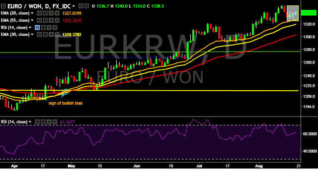 We prefer to take long position on EUR/KRW around 1,335, stop loss at 1,325 and target of 1,349.