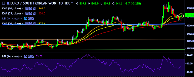 We prefer to take long position on EUR/KRWaround 1,340, stop loss 1,332 and target of 1,373.