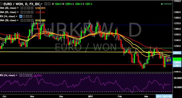 We prefer to take long position in EUR/KRW around 1,205, stop loss at 1,199 and target of 1,214/1,228.