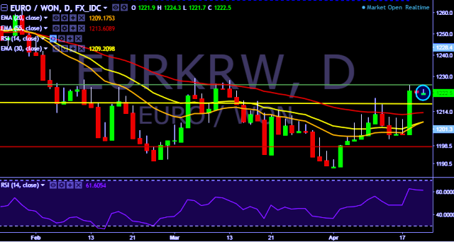 We prefer to take long position in EUR/KRW only above 1,226, stop loss at 1,217 and target of 1,233/1,242.