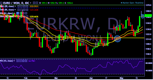 We prefer to take long position in EUR/KRW around 1,251, stop loss at 1,240 and target of 1,260/1,287.