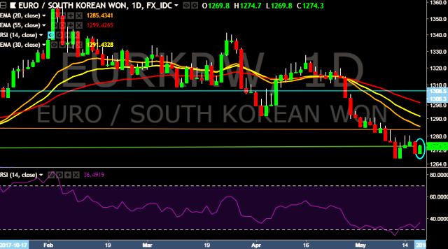 We prefer to take long position on EUR/KRW only above 1,280, stop loss at 1,267 and target of 1,302.