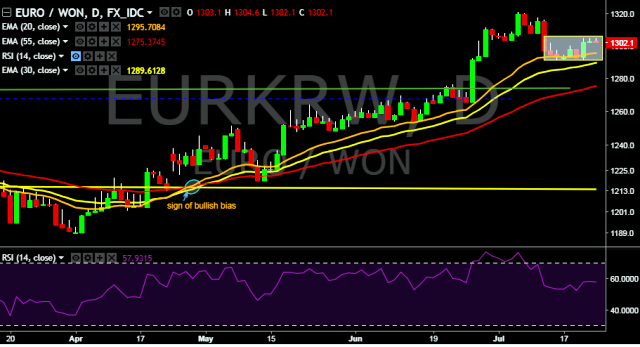 We prefer to take long position in EUR/KRW only above 1,304, stop loss at 1,290 and target of 1,321/1,338.