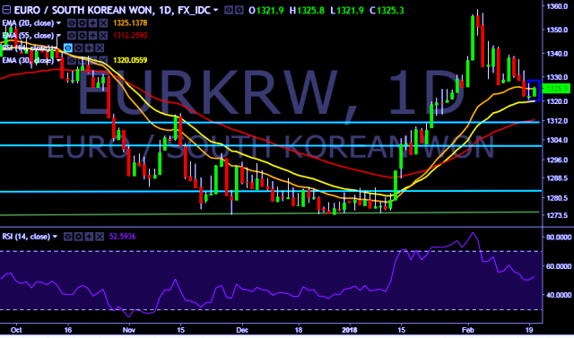 We prefer to take long position on EUR/KRW only above 1,327, stop loss at 1,320 and target of 1,355.