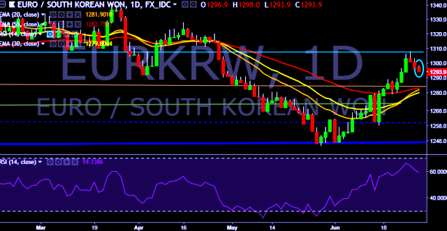 We prefer to take short position on EUR/KRW around 1,296, stop loss at 1,302 and target of 1,286/1,277.