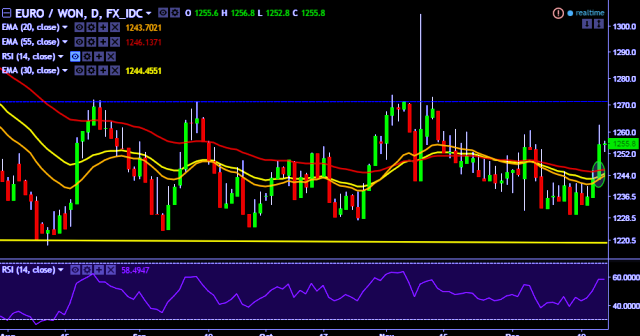 - EUR/KRW is currently trading around 1,255 mark.