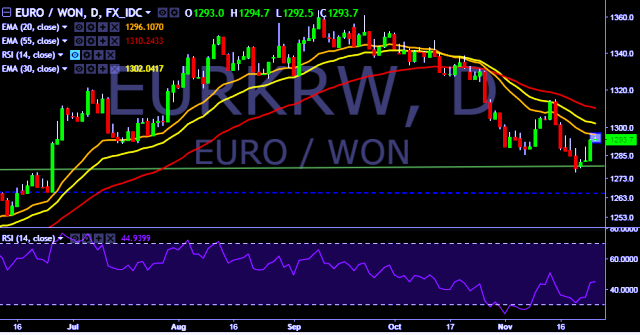 We prefer to take long position on EUR/KRW only above 1,295, stop loss at 1,287 and target of 1,302/1,313.