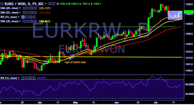 We prefer to take long position in EUR/KRW around 1,302, stop loss at 1,290 and target of 1,321.