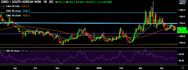 We prefer to take short position on EUR/KRW only below 1,320, stop loss at 1,333 and target of 1,307/1,298.