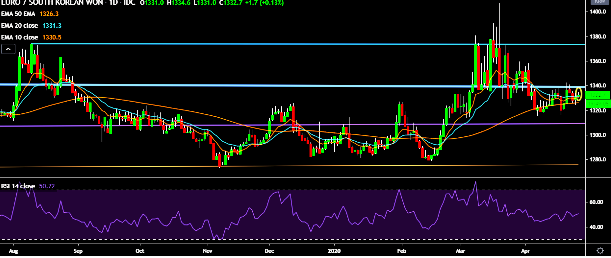 - EUR/KRW is currently trading around 1,332 mark.