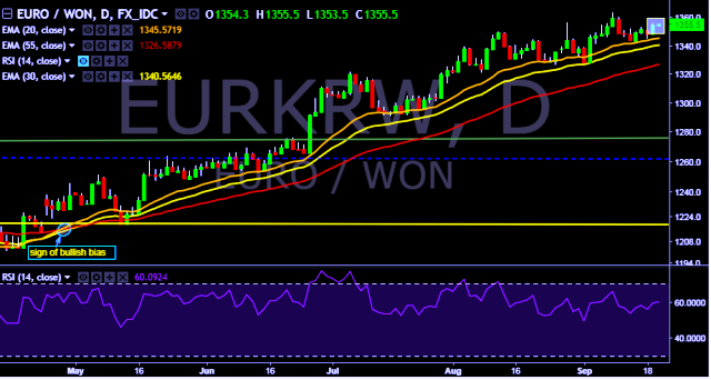 We prefer to take long position on EUR/KRW around 1,351, stop loss at 1,346 and target of 1,363.