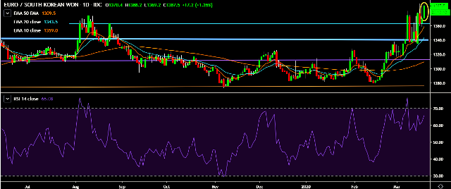 We prefer to take long position on EUR/KRW around 1,380, stop loss at 1,360 and target of 1,428.