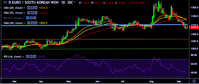 - EUR/KRW is currently trading around 1,315 mark.
