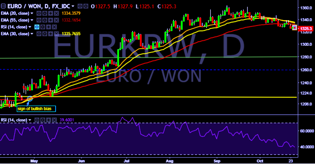 We prefer to take short position on EUR/KRW only below 1,325, stop loss at 1,338 and target of 1,313.
