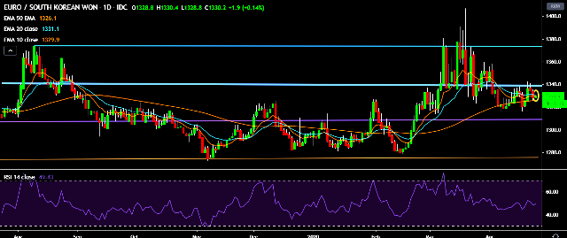 We prefer to take short position on EUR/KRW only below 1,325, stop loss at 1,336 and target of 1,307/1,298.