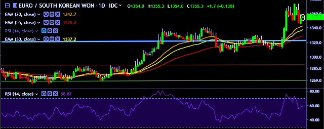 We prefer to take long position on EUR/KRW only above 1,358, stop loss 1,346 and target of 1,373/1,392.