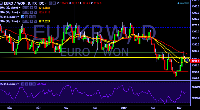 We prefer to take short position in EUR/KRW only below 1,215, stop loss at 1,229 and target of 1,209/1,199.