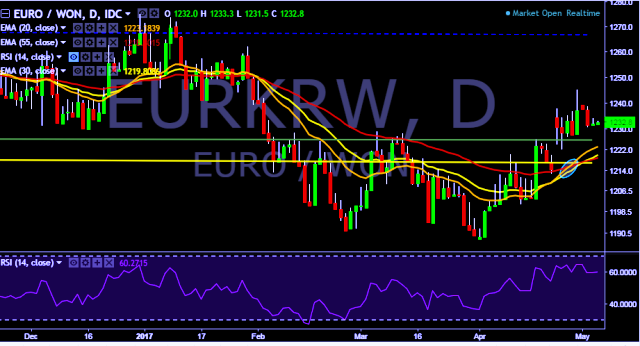 We prefer to take long position in EUR/KRW around 1,232, stop loss at 1,227 and target of 1,252.