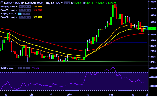 We prefer to take lonh position on EUR/KRW only above 1,322, stop loss at 1,316 and target of 1,343.