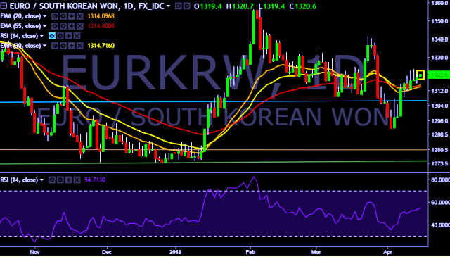 We prefer to take long position on EUR/KRW only above 1,320, stop loss at 1,315 and target of 1,332/1,340.
